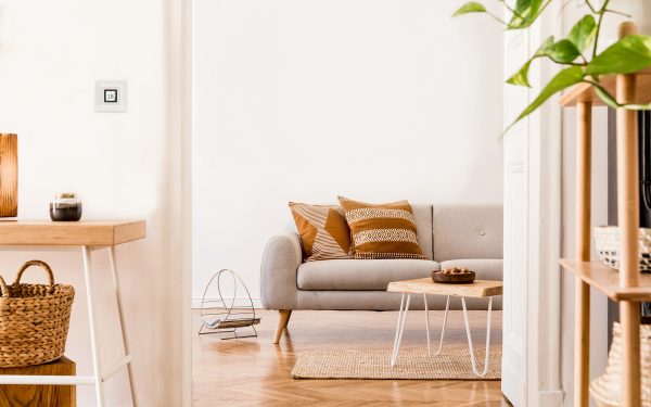 Stue i en bolig med tidsstyrt belysning for å spare strøm